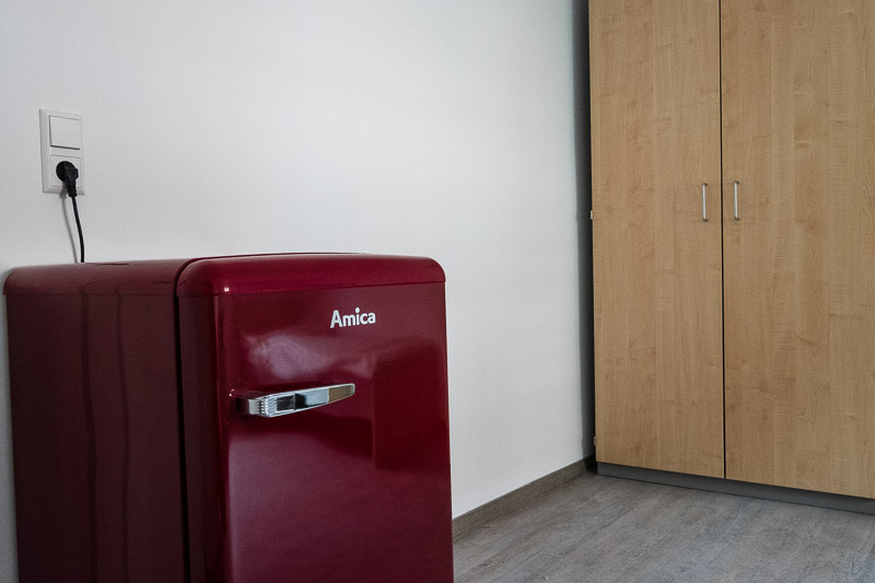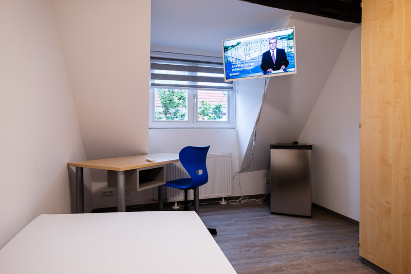 Alle Zimmer sind voll möbliert mit Bett, Schrank, Schreibtisch, einem Bürodrehstuhl, einem Fernsehgerät sowie einem Kühlschrank. Auf Gemeinschaftskühlschränke in der Küche haben wir aus hygienischen Gründen ganz verzichtet. Schnelle Internetzugänge per LAN und WLAN sind als kostenlose Zusatzleistung im ganzen Haus verfügbar.
